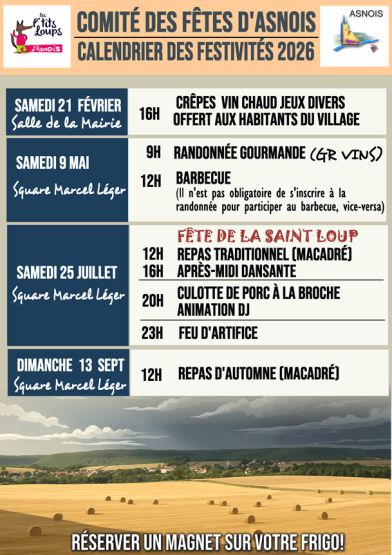 CALENDRIER DES FESTIVITES ORGANISEES PAR LE COMÎTE DES FÊTES D'ASNOIS EN 2026