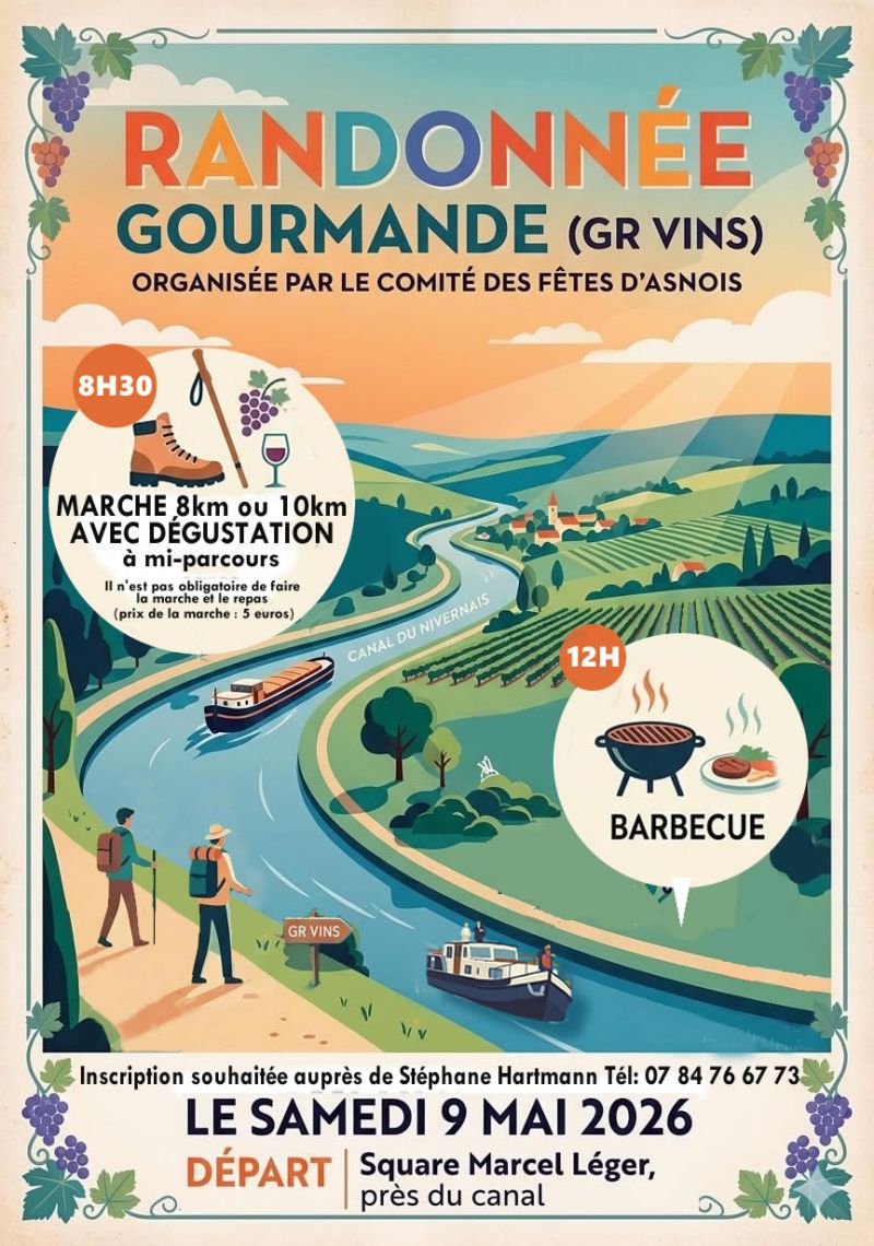 Le Comité des Fêtes d'Asnois a le plaisir de vous convier à son événement incontournable du printemps : le GR VINS ! Rejoignez-nous le samedi 9 mai pour une randonnée gourmande exceptionnelle au cœur du Haut Nivernais, où le plaisir de la marche se marie à la perfection avec la richesse de notre terroir.