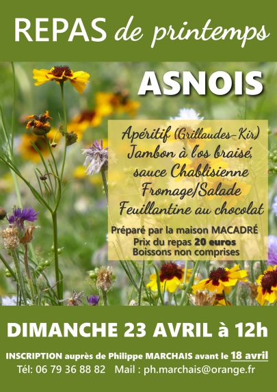 Pour fêter le retour du Printemps, le comité des fêtes d'ASNOIS organise son traditionnel repas de Printemps le dimanche 23 avril prochain à 12h.