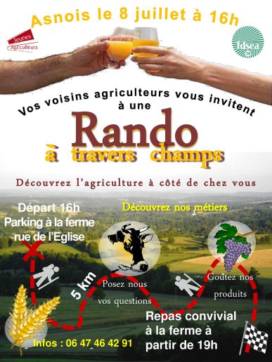 Venez participer à "LA RANDO à TRAVERS CHAMPS" le 8 juillet à ASNOIS, départ 16h.