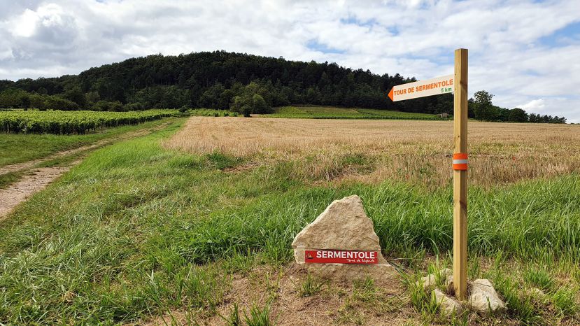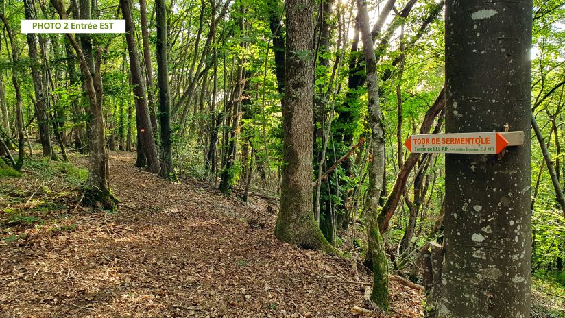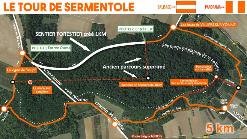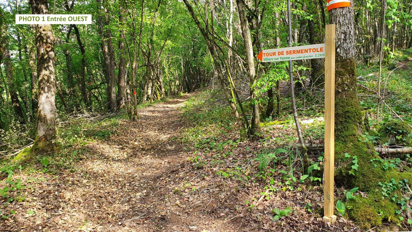 Pour pouvoir proposer un circuit boucle « LE TOUR DE SERMENTOLE », point d’orgue de nos quatre circuits boucles sur cette magnifique colline de SERMENTOLE qui fait partie de notre patrimoine culturel depuis des siècles, nous avons créé un sentier forestier ( 1 km) sur le bord nord de la colline versant Villiers sur Yonne qui permet d’assurer la jonction en évitant d’utiliser le passage dans le bois du plateau.